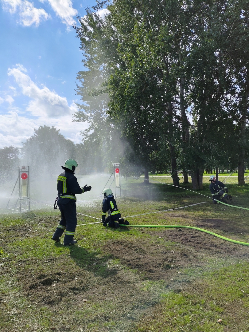 As part of the competition discipline "expansion from a motor pump", participants had to demonstrate their skills in pulling out hoses, connecting them, operating a motor pump, supplying water through hoses from a body of water, and filling targets with water.