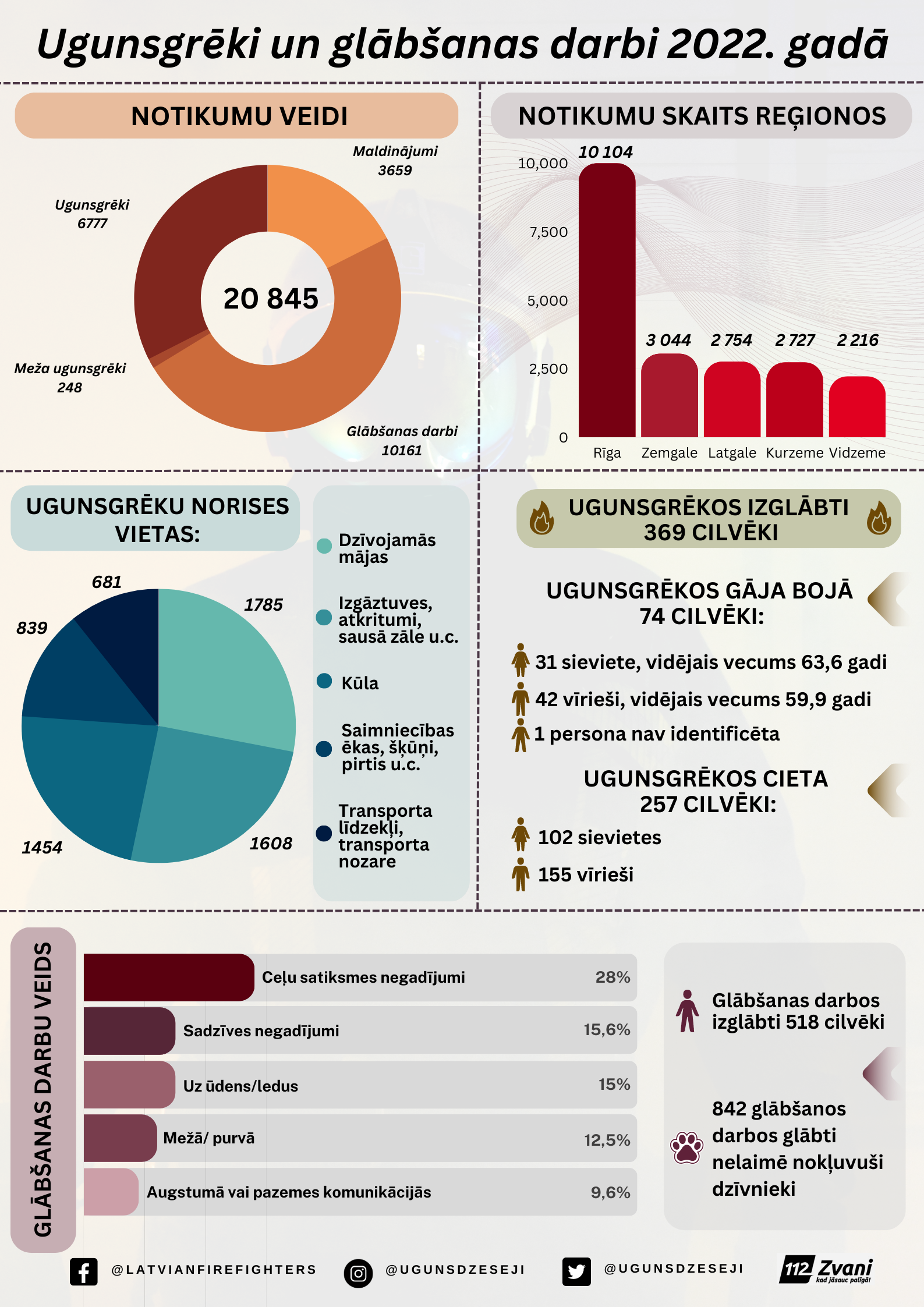 Kopumā 2022. gadā ugunsdzēsēji glābēji devās uz 20 845 izsaukumiem, no tiem 6 777 izsaukumi bija uz ugunsgrēkiem, 248 – uz meža ugunsgrēkiem, 10 161 uz glābšanas darbiem, bet 3 659 bija maldinājumi.